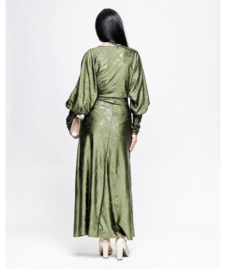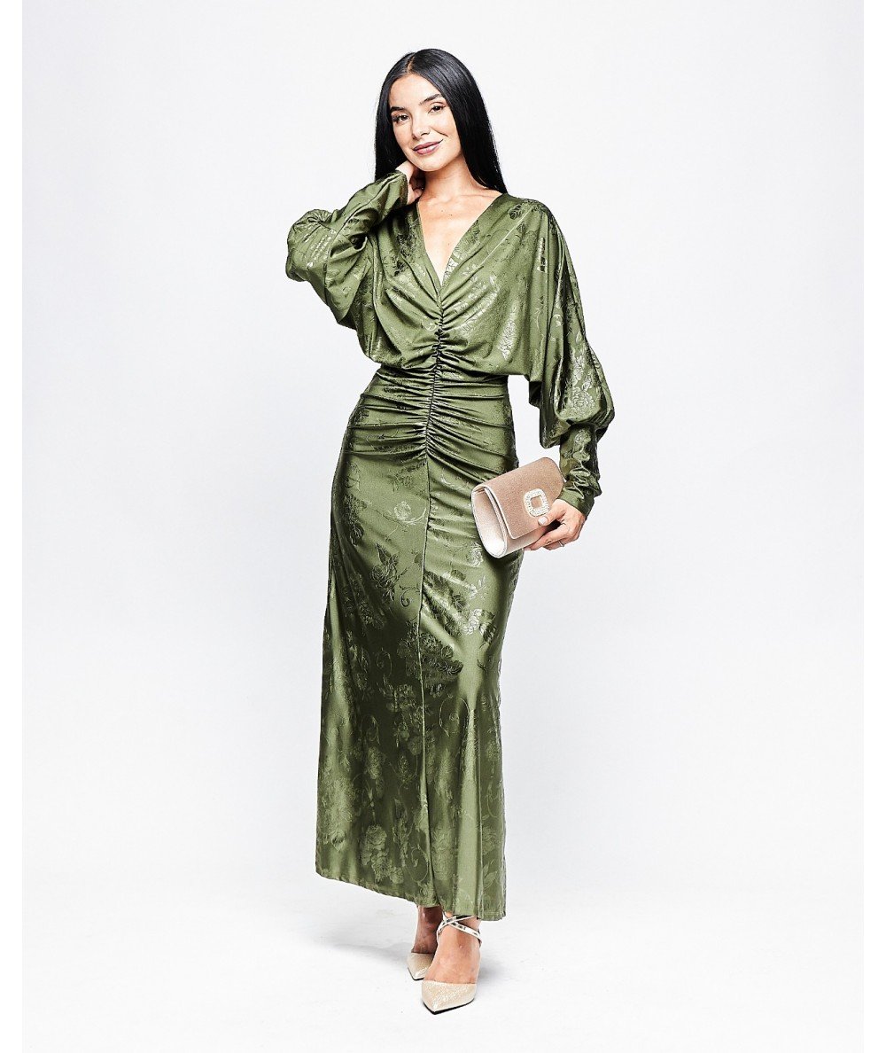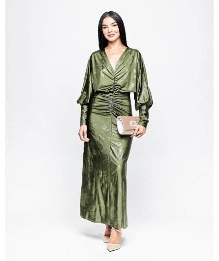 Vestido verde en tejido elástico con estampado floral. Tiene manga larga y drapeado en la parte delantera del vestido.Vestido color verde en tejido elástico con estampado floral. Tiene manga larga y drapeado en la parte delantera del vestido.
