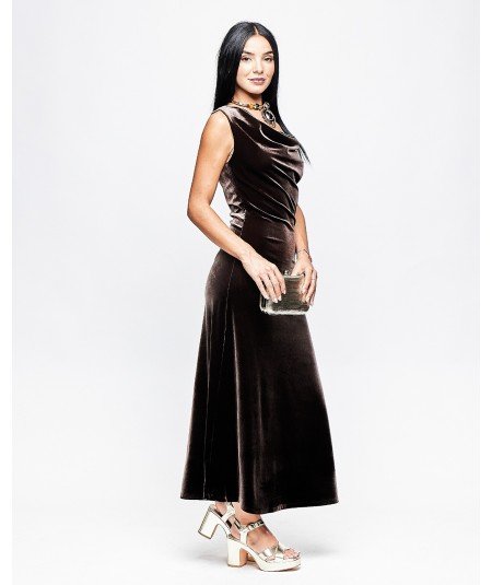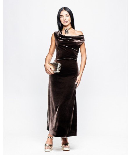 Vestido maxi velvet escote cascada tiene tres colores marrón burdeos y verde, el tejido terciopelo con elástico .
